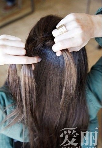 编蜈蚣辫的时候,每次挑起左侧的一小缕发丝加入正在编的发辫中。编至发辫需要转向右侧的时候,开始每次加入右侧的一小缕发丝加入发辫中,并且将发辫的右侧稍稍收紧,这样可以将发辫慢慢引向右侧。